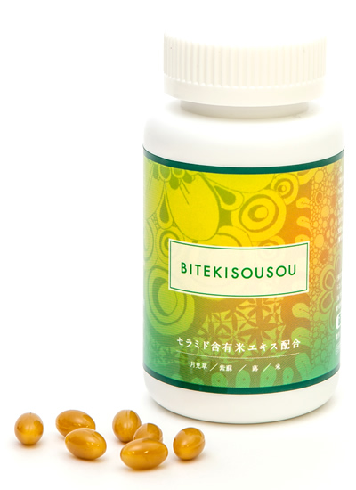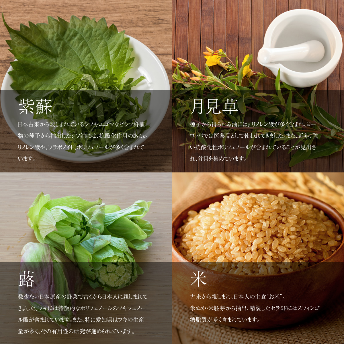 シソ油、月見草油、フキエキス加工粉末、シソ種子エキス加工粉末、セラミド含有米エキス加工粉末、ゼラチン、グリセリン、グリセリン脂肪酸エステル、ミツロウ、シクロデキストリン